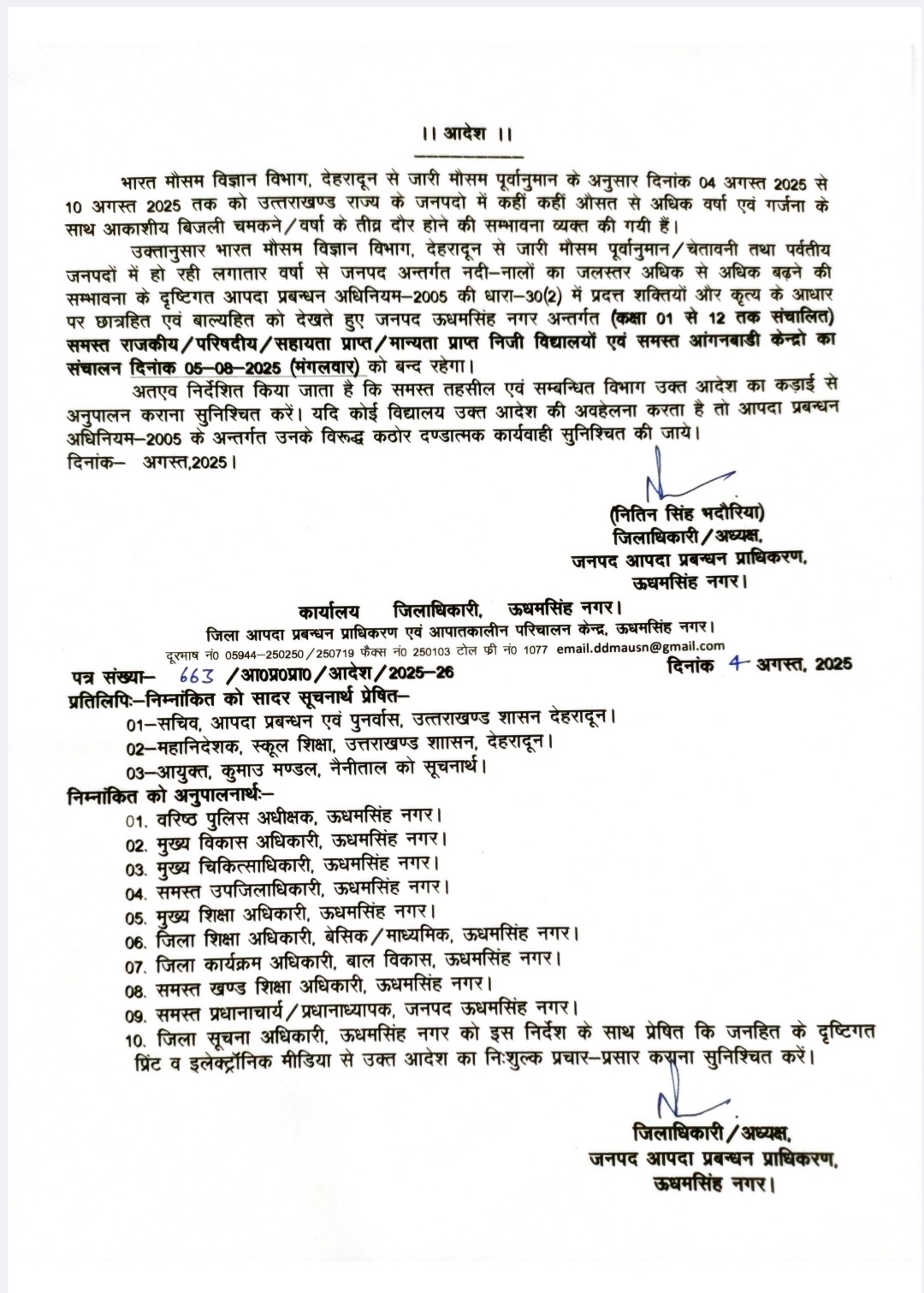 उक्तानुसार भारत मौसम विज्ञान विभाग, देहरादून से जारी मौसम पूर्वानुमान / चेतावनी तथा पर्वतीय जनपदों में हो रही लगातार वर्षा से जनपद अन्तर्गत नदी-नालों का जलस्तर अधिक से अधिक बढ़ने की सम्भावना के दृष्टिगत आपदा प्रबन्धन अधिनियम-2005 की धारा-30(2) में प्रदत्त शक्तियों और कृत्य के आधार पर छात्रहित एवं बाल्यहित को देखते हुए जनपद ऊधमसिंह नगर अन्तर्गत (कक्षा 01 से 12 तक संचालित) समस्त राजकीय / परिषदीय/सहायता प्राप्त / मान्यता प्राप्त निजी विद्यालयों एवं समस्त आंगनबाडी केन्द्रो का संचालन दिनांक 05-08-2025 (मंगलवार) को बन्द रहेगा।