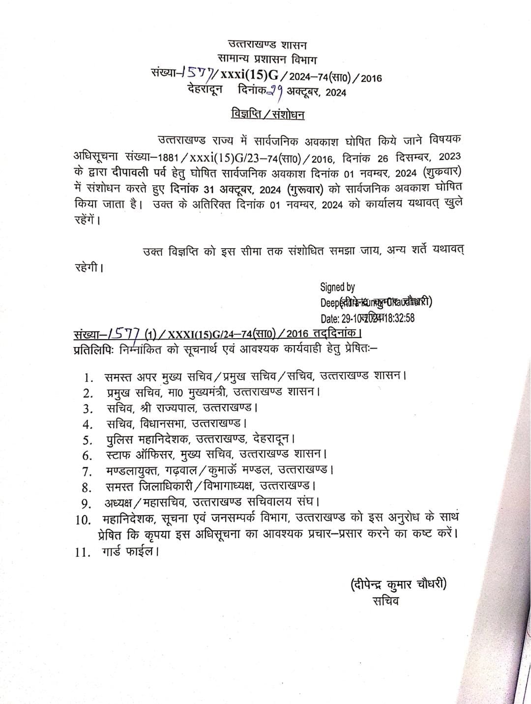 उत्तराखंड में 1 नवंबर की जगह 31 अक्टूबर को होगी दीपावली की छुट्टी, कर्मचारियों में नाराजगी