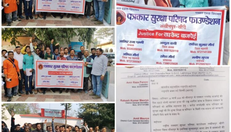 जानकारी के मुताबिक 8 मार्च को पत्रकार राघवेंद्र बाजपेई की सीतापुर जिले के महोली थाना क्षेत्र में रोड पर अज्ञात हमलावरों ने गाड़ी में टक्कर मारकर चार गोली मारकर निर्मम हत्या कर दी थी। मौके पर पहुंची पुलिस ने शव को कब्जे में लेकर जांच पड़ताल शुरू कर शक के आधार पर आठ लोगों को पुलिस ने हिरासत में लिया है। लेकिन अभी तक पुलिस मुख्य आरोपियों को नहीं पकड़ सकी है। जिसके चलते सोमवार को लखीमपुर खीरी में आक्रोशित पत्रकार सुरक्षा परिषद फाउंडेशन के पदाधिकारियों व सदस्यों ने डाक्टर भीमराव आंबेडकर पार्क से लेकर जिला कलेक्ट्रेट सभागार तक नारेबाजी करते हुए काली पटटी बांधकर विरोध प्रदर्शन करते हुए पहुंचे वहाँ पर सीतापुर तहसील प्रशासन मुर्दाबाद के नारे लगाए तथा जिलाधिकारी को राष्ट्रपति को संबोधित ज्ञापन सौंपा। जिसमें मांग की गई कि सीतापुर के इमलिया सुल्तानपुर थाना क्षेत्र में बदमाशों की गोलियों के शिकार हुए पत्रकार राघवेंद्र बाजपेई की हत्या से पत्रकार जगत में गहरा शोक है और घटना की घोर निंदा करते हुए मांग की उत्तर प्रदेश शासन दिवंगत पत्रकार के परिजनों को एक करोड़ रूपये की आर्थिक सहायता दे व बच्चों को नि:शुल्क शिक्षा व परिवार के किसी एक सदस्य को सरकारी नौकरी दिलाई जाये। इसके साथ ही घटना की उच्च स्तरीय जांच कराते हुए हत्यारोपियों के खिलाफ सख्त कार्यवाही की मांग की है। यदि आरोपियों के खिलाफ तत्काल प्रभाव से कार्यवाही नहीं की गई, तो राष्ट्रीय पत्रकार सुरक्षा परिषद फाउंडेशन 15 मार्च को पूरे भारत में अनिश्चित कालीन धरना प्रदर्शन करने करने को मजबूर होगा। इस धरना प्रदर्शन व ज्ञापन में अब्दुल कवि जिलाध्यक्ष, राकेश कुमार मौर्य जिला महामंत्री, अमित मौर्य सह महामंत्री, संरक्षक आमिर रजा पम्मी व उपाध्यक्ष सलीम खां, मुनेन्द्र पाल वर्मा, विशाल भारद्वाज, मनोज मिश्रा सचिव, मुजीबुर्रहमान खां, अमित मिश्रा, गोपाल कृष्ण अवस्थी जिला संयोजक, मनीष गुप्ता, विधिक सलाहकार राहुल सिंह, राजू शुक्ला साबिर महेवागंज प्रभारी,सईद खीरी प्रभारी अंशुमान सिंह सचिव सदस्य मनीष धवन, रमेश मौर्य कोषाध्यक्ष, पवन कुमार गुप्ता, श्याम पांडेय, मासूक अली, प्रेम पाल, नीरज यादव, विशाल गोस्वामी, ऋषि भसीन, मेराज अहमद, सुनील यादव, नीरज जायसवाल, हिमांशु आदि सदस्य मौके पर मौजूद रहे।