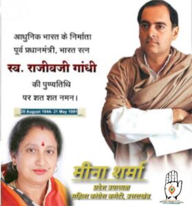 इससे पूर्व कांग्रेस के वरिष्ठ नेता और पूर्व दर्जा राज्यमंत्री हरीश बावरा के नेतृत्व में दर्जनों कांग्रेस कार्यकर्ता राजीव नगर इंदिरा आदर्श बंगाली कॉलोनी में एकत्र हुए जहां पूर्व प्रधानमंत्री युवा हृदय सम्राट स्वर्गीय राजीव गांधी की प्रतिमा पर माल्यार्पण करने के पश्चात उन्हें श्रद्धांजलि दी गई और उन्हें नमन किया गया l इस अवसर पर कार्यकर्ताओं ने जब तक सूरज चांद रहेगा राजीव तेरा नाम रहेगा राजीव तेरा ये बलिदान याद करेगा हिंदुस्तान आदि गगनभेदी नारे लगाकर उन्हें याद किया l इस अवसर पर उत्तराखंड प्रदेश महिला कांग्रेस कमेटी की वरिष्ठ उपाध्यक्ष और 66 विधानसभा रुद्रपुर से कांग्रेस की तरफ से विधायक का चुनाव लड़ी पूर्व पालिका अध्यक्ष श्रीमती मीना शर्मा ने कहा कि स्वर्गीय राजीव गांधी ने अपने प्रधानमंत्रीत्व काल में देश को बुलंदियों पर ले जाने का कार्य किया l उन्होंने महिला सशक्तिकरण पंचायती राज और युवाओं को मजबूत बनाने के लिए अनेकानेक कार्य किए जिसे देश कभी भुला नहीं सकता l पूर्व महानगर कांग्रेस कमेटी के अध्यक्ष जगदीश तनेजा ने भी स्वर्गीय राजीव गांधी को अपनी श्रद्धांजलि देते हुए कहा कि भारत रत्न से सम्मानित स्वर्गीय गांधी ने प्रधानमंत्रीत्व काल में देश को नई दिशा और दशा प्रदान की l इस अवसर पर महानगर यूथ कांग्रेस के अध्यक्ष रंजीत सिंह राणा महानगर महिला कांग्रेस कमेटी की अध्यक्ष मोनिका ढाली महानगर कांग्रेस सेवादल के अध्यक्ष संजीव रस्तोगी महानगर कांग्रेस कमेटी अनुसूचित जाति प्रकोष्ठ के अध्यक्ष रामप्रसाद महानगर किसान कांग्रेस के अध्यक्ष रामदयाल सिंह एनएसयूआई के पूर्व अध्यक्ष चेतन भट्ट वार्ड अध्यक्ष खगोपती विश्वास पूर्व वार्ड अध्यक्ष अशोक मंडल कांग्रेस के वरिष्ठ नेता विधान सरकार राजीव कामरा डॉक्टर सुमित राय पूर्व सभासद इंद्रजीत सिंह रविंद्र गुप्ता श्रीमती सरोज शर्मा गीता सरकार इंद्रावती सुनीता रानी एडवोकेट संजय आईस विकास विश्वास विमल धरामी गौतम घरामी बादल कविराज दिलशाद अहमद जयदेव मदक आनंद शर्मा अनिल शर्मा सहित बड़ी संख्या में अन्य कांग्रेस कार्यकर्ता उपस्थित थे l