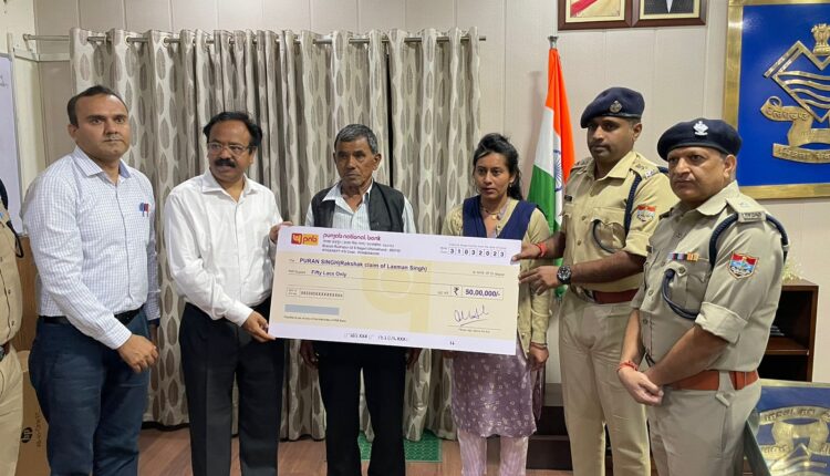 ऊधमसिंहनगर। दिनांक 04-04-2023 को पंजाब नेशनल बैंक के अधिकारियों व वरिष्ठ पुलिस अधीक्षक द्वारा मृतक आरक्षी लक्ष्मण सिंह के पिताजी व उनकी पत्नी को ₹ 50 लाख की आर्थिक सहायता का चेक प्रदान किया गया