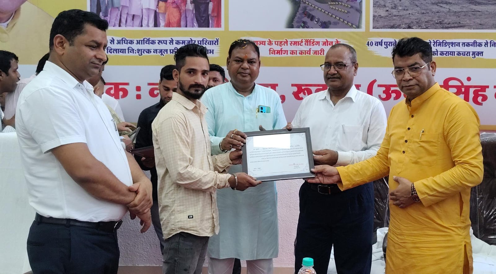इस दौरान नजूल भूमि पर बसे आर्थिक रूप से कमजोर परिवारों को नजूल भूमि का निःशुल्क मालिकाना हक प्राप्त कराने हेतु नगर निगम की ओर से उत्कृष्ट कार्य करने वाले अधिकारी एवं कर्मचारी (टीम लीडर) शिप्रा जोशी पाण्डेय, उप नगर आयुक्त, दीपक गोस्वामी सहायक नगर आयुक्त, श्रीमती राजू नाबियाल, सहायक नगर आयुक्त, ( डोर टू डोर पैमाइश से संबंधित कार्य) श्री शारिक अली (मानचित्रकार), नीरज, धीरेन्द्र, शुभम श्रीवास्तव, जसवीर, किशोर (बहुउददेशीय कर्मी), सागर नेगी, भूपेन्द्र सिंह, मनोज गहतोड़ी (वर्क एजेन्ट), भारत कुमार (परिचारक), ( डोर टू डोर जाकर पत्रावलियों से संबंधित कार्य ) हेम उनियाल (नजूल लिपिक), चन्द्रजीत सिंह (कर संग्रहकर्ता) कुल 15 लोगों का प्रशस्ति पत्र देकर सम्मानित किया गया। इस क्रम में दीनदयाल अन्तयोदय राष्ट्रीय शहरी आजीविका मिशन के अन्तर्गत ओम शान्ति स्ंवय सहायता समूह को 2 लाख का चैक एवं पीएम स्वनिधि योजना के अन्तर्गत प्रेमशंकर, धर्मेन्द्र, केदार दत्त एवं हेमराज को 50-50 हजार का चेक वितरित किया गया।