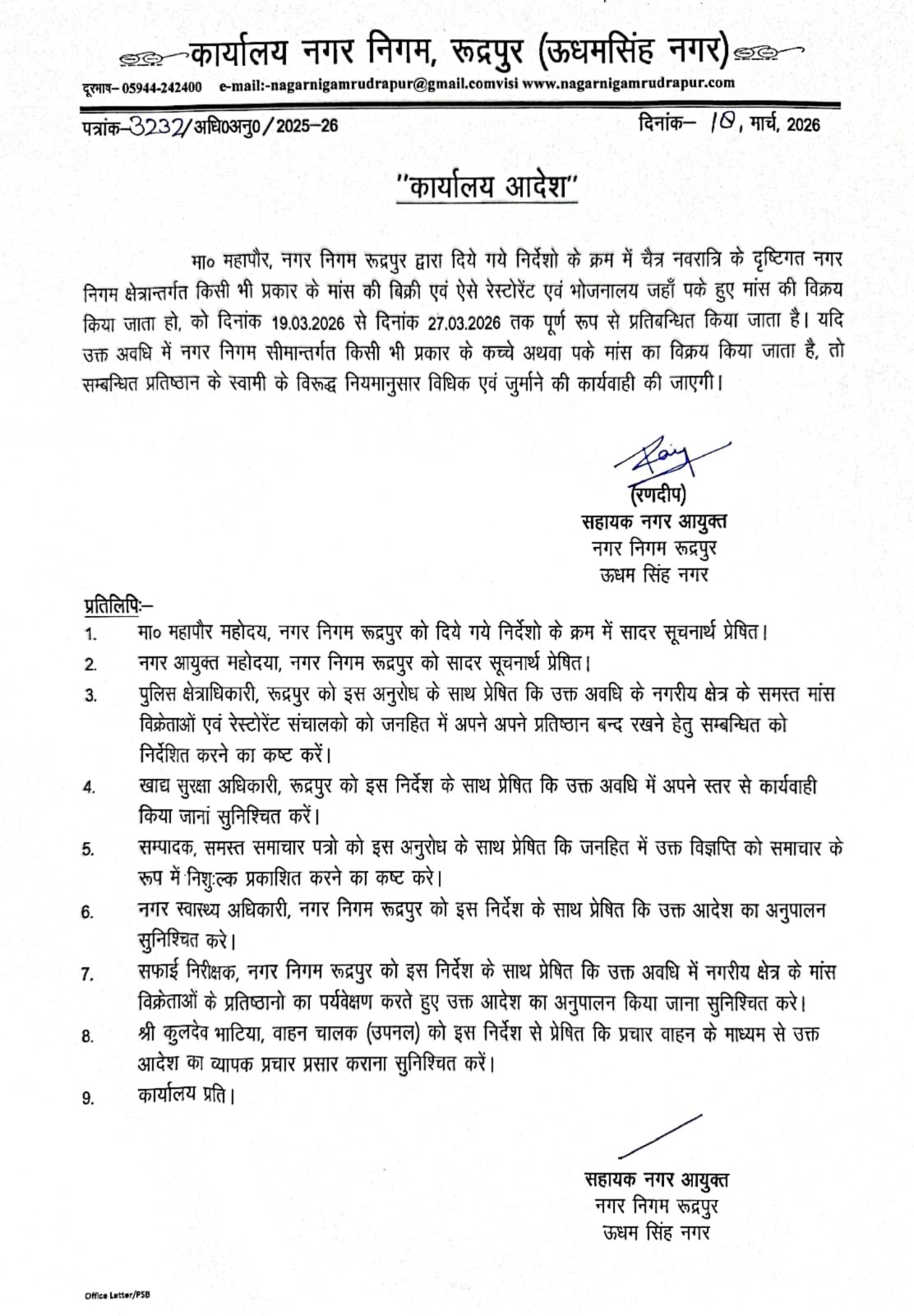 रुद्रपुर। चैत्र नवरात्र के पावन पर्व को देखते हुए नगर निगम प्रशासन ने शहर की आध्यात्मिक मर्यादा और स्वच्छता बनाए रखने के लिए बड़ा निर्णय लिया है। नगर निगम क्षेत्र के अंतर्गत मीट-मांस की बिक्री पर पूर्ण प्रतिबंध लगा दिया गया है। यह आदेश 19 मार्च से प्रभावी होकर नवरात्र की समाप्ति यानी 27 मार्च 2026 तक कड़ाई से लागू रहेगा।